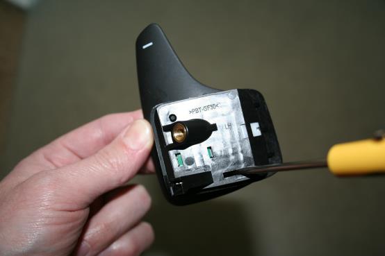 #7. Locate the access window on the reverse side of the paddle shifter switch module. Insert a small flat-head screwdriver through window and push upwards on the paddle shifter pivot pin.